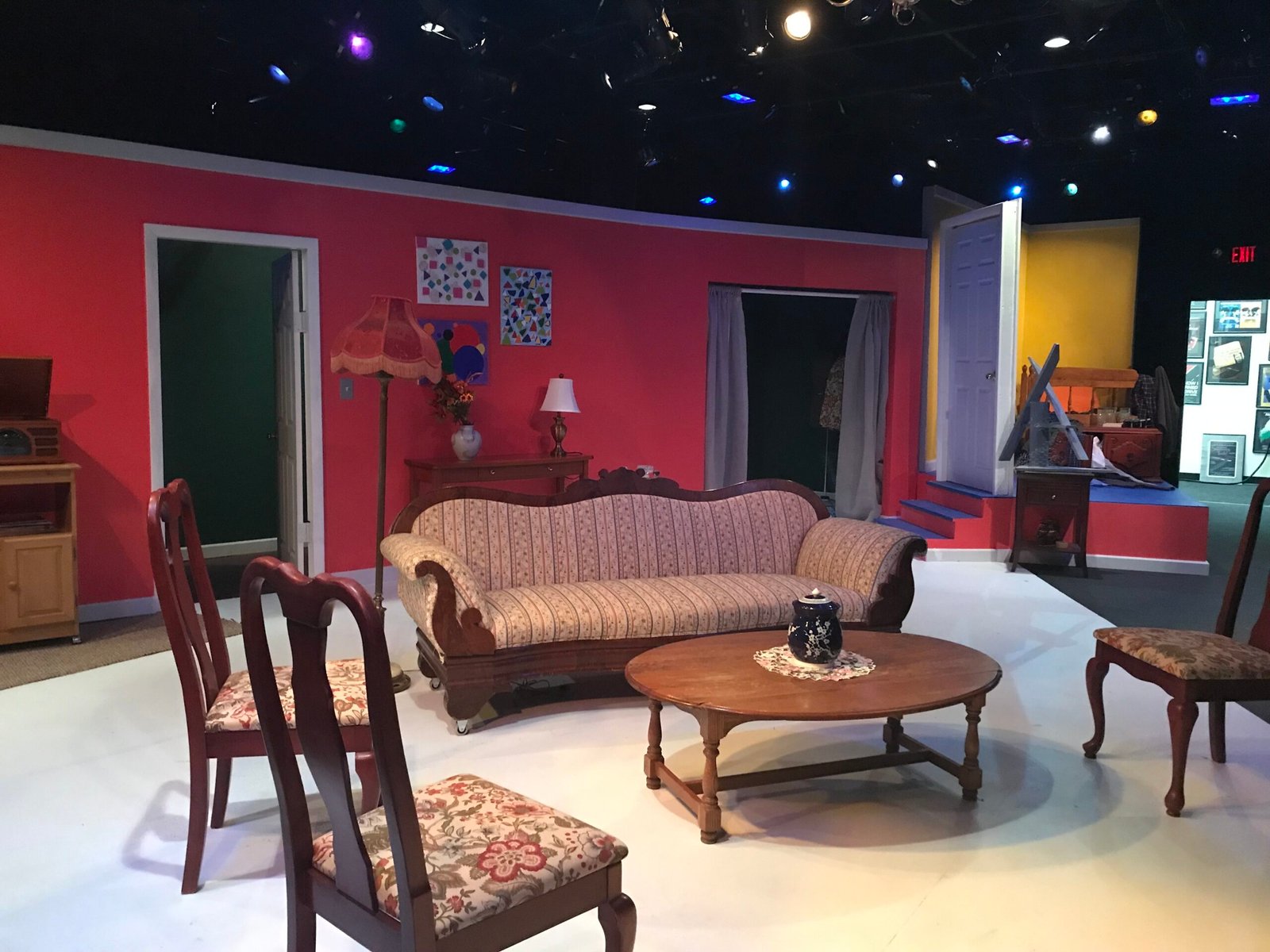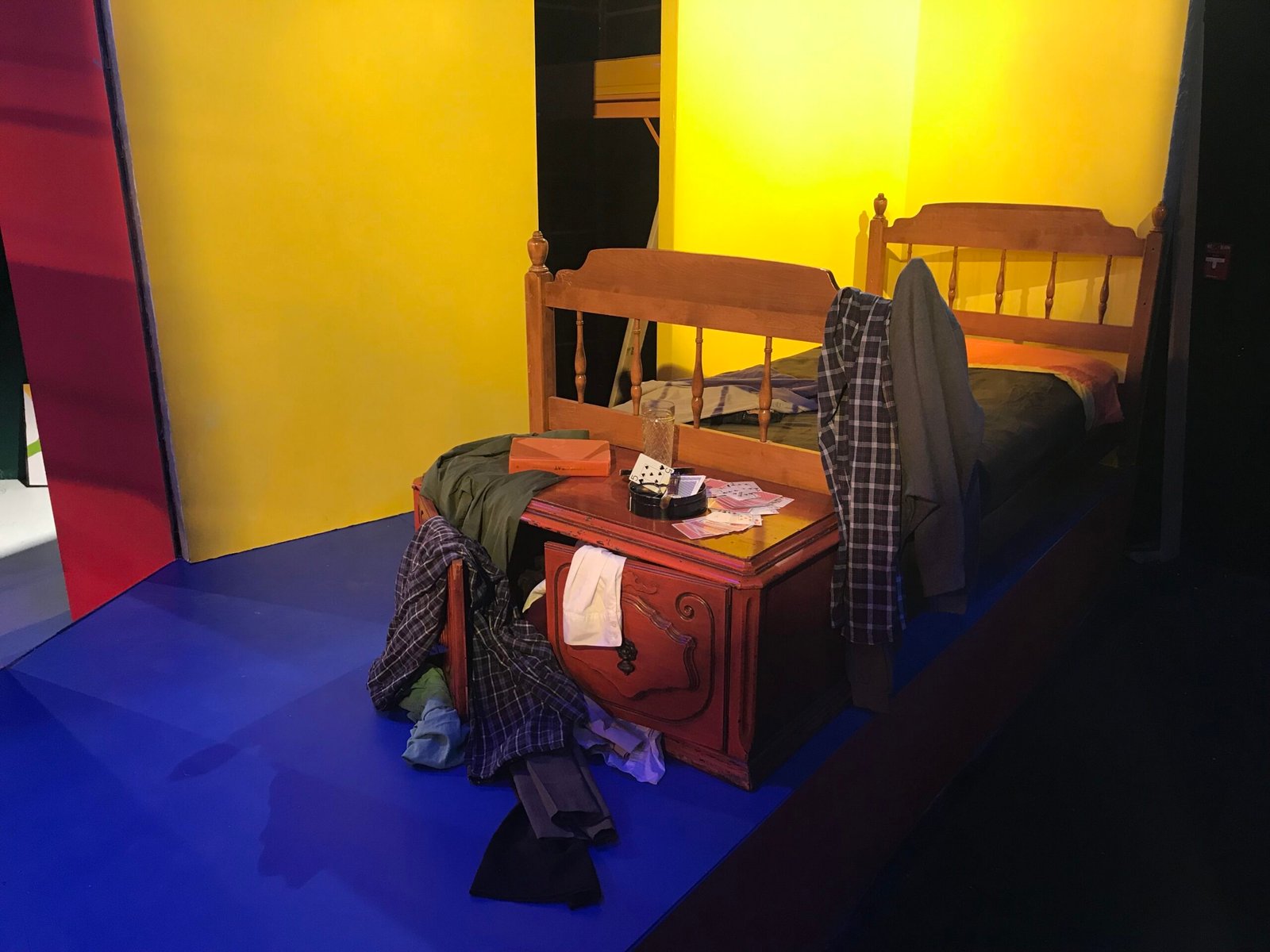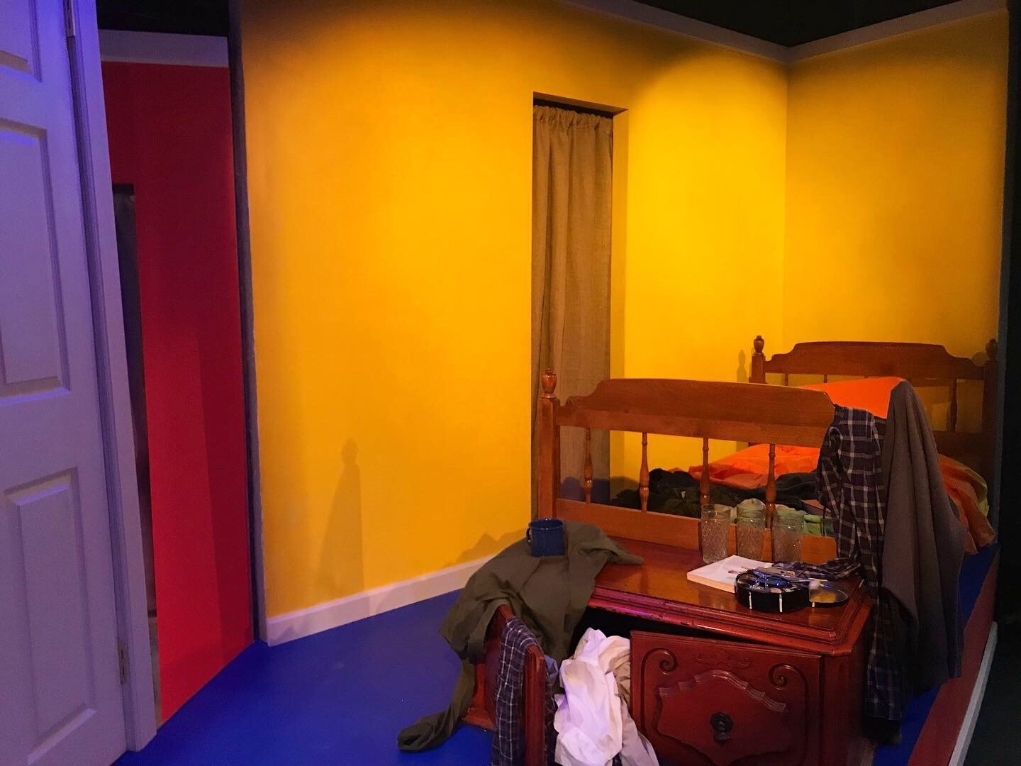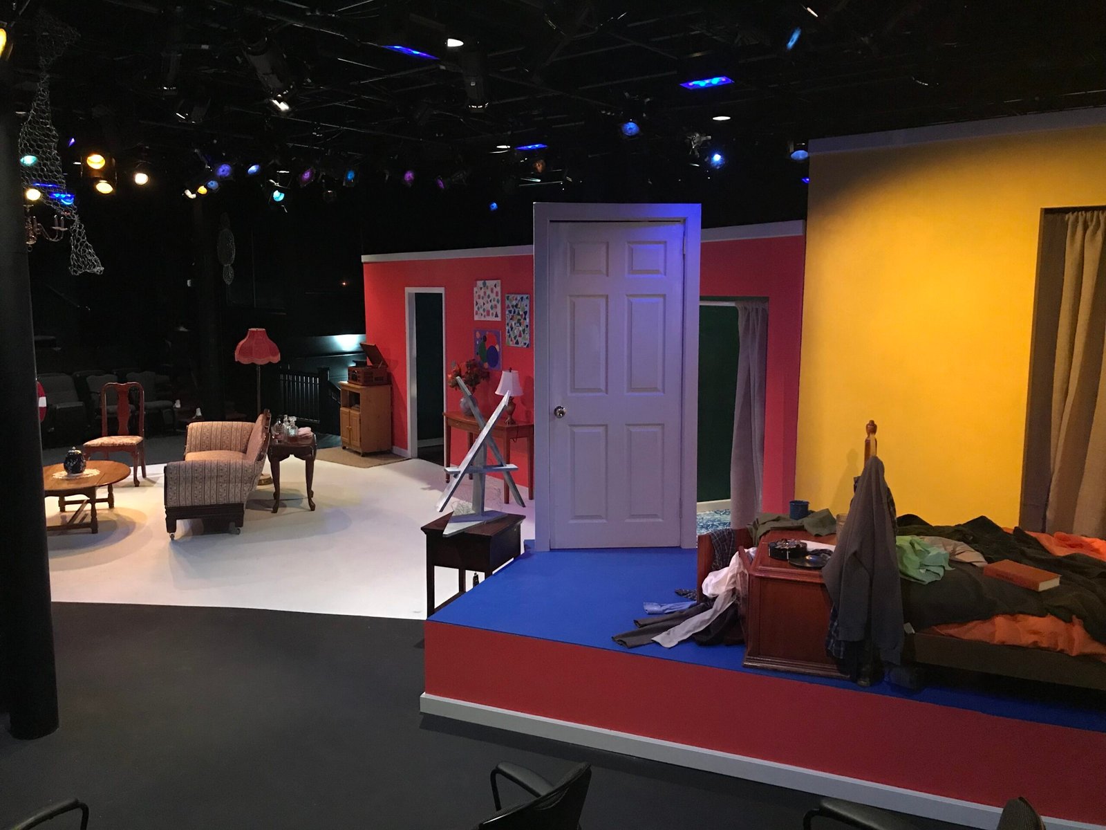This comedic play Black Comedy is set in the UK in the late 60s, about a poor artist named Brinsley. With such context, I drew my inspirations from the movies: 2001: A Space Odyssey (1968), and A Clockwork Orange (1971). The most noticeable feature of the set I designed is the use of geometric design, and pop colors. As Brinsley’s art is not conventional, these two elements complement his characterization, as well as connects to the Hippie culture that was born during that time period.