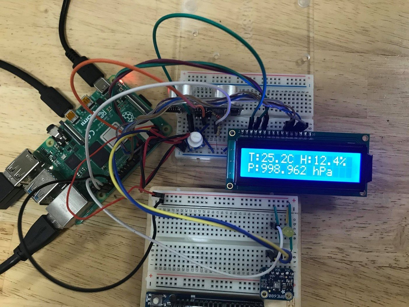 The scope of this project is to create a device that enables traditional fridges to have additional functionalities, using RPi 4, an ultrasonic proximity sensor HC-SR04, a temperature-humidity-pressure sensor BME680, and a 16×2 Character LCD.